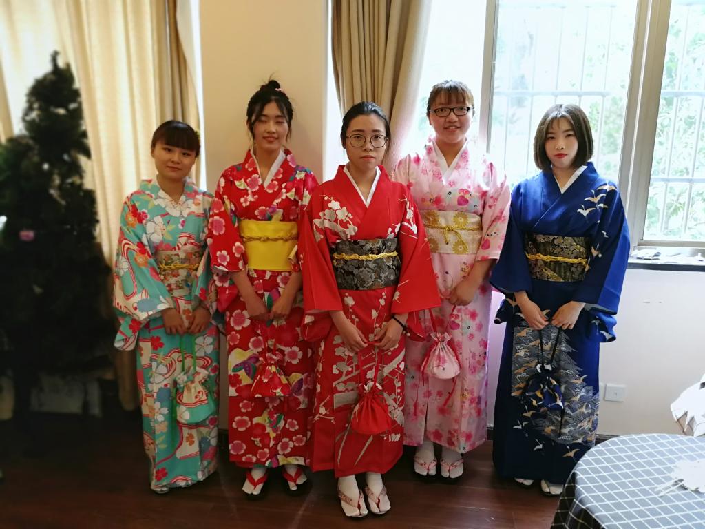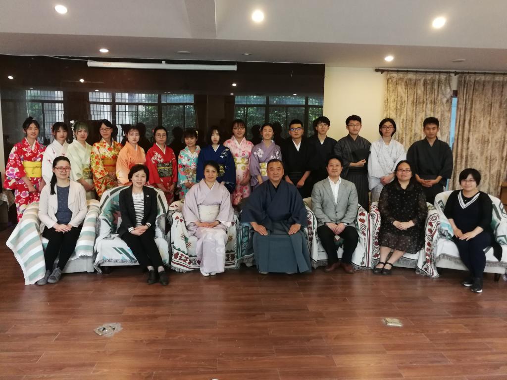 2018年4月26日,日语专业客座教员、原嘉兴日系企业协会会长、嘉兴杰富意精密钢管有限公司总经理青柳昌司先生携助手前来av在线 ,为日语专业学生举办了一场身着优雅和服,感受“一期一会”茶道思想的日本文化体验课。