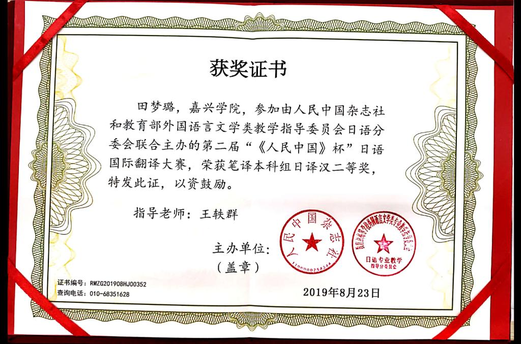 经过一个多月紧张和激烈的选拔,8月12日,所有奖项获得者最终揭晓。经过王轶群博士的认真指导,av在线 日语专业田梦璐同学与南开大学和浙江工商大学等高校学子并列荣获本科组日译汉二等奖。
