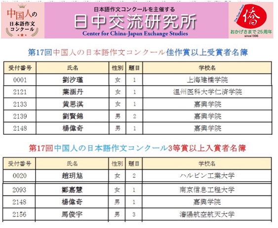 近日,经过长达4个月的严格评审,“第17届中国人日语作文大赛”获奖名单揭晓。av在线 日语专业学子的日语作文从来自全国27个省、直辖市和自治区的165所学校 3198篇投稿作文中脱颖而出,杨伟奇同学获三等奖,黄思淇和刘贤锦两位同学分获佳作奖,指导教师周艳君老师获“优秀园丁奖”。