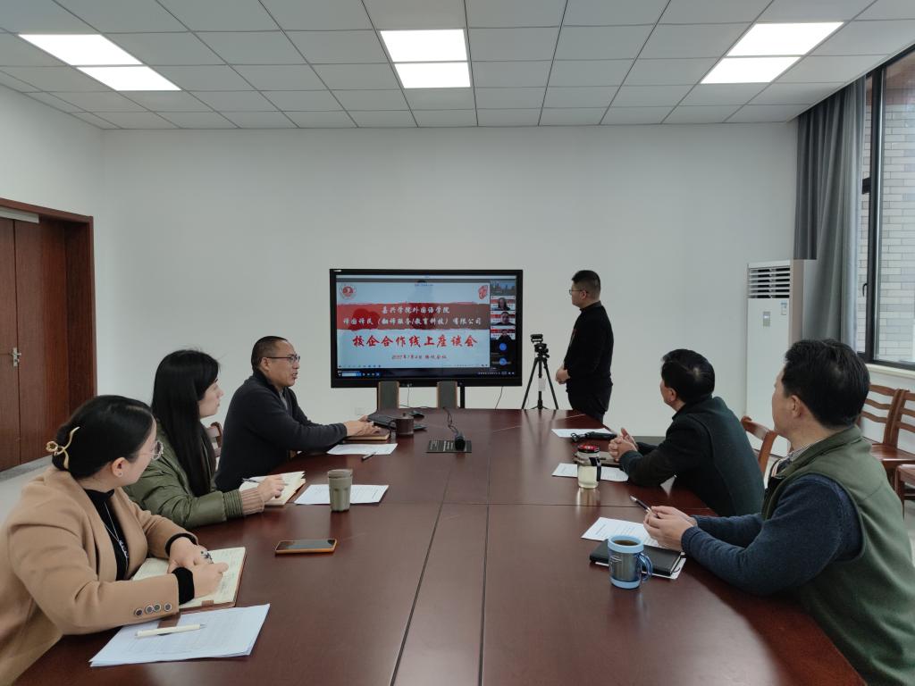 1月4日,av在线 与译国译民(翻译服务/教育科技)有限公司举行校企合作线上见面会,双方就开展校企合作进行洽谈。会议由副院长喻锋平主持,学院领导班子成员参加见面会。