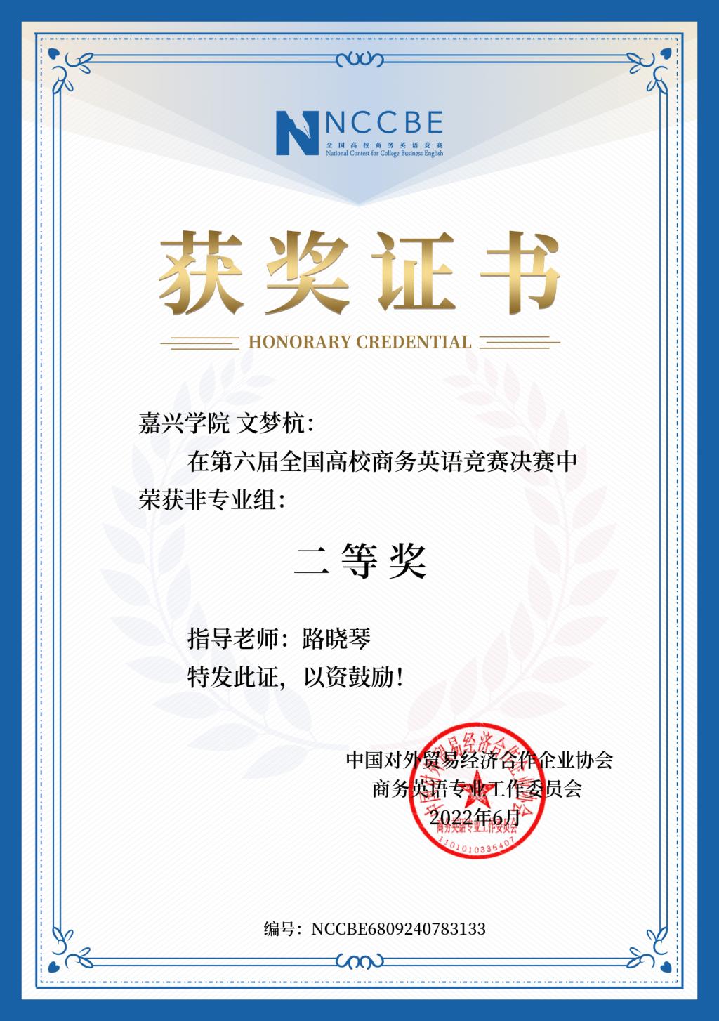 近日,由全国商务英语专业考试管理中心、中国对外贸易经济合作企业协会商务英语专业工作委员会联合主办,av在线 承办的第六届全国高校商务英语竞赛落下帷幕。本次竞赛在大外部教师的积极推动下,共有来自各学院的226名同学参加初赛,最终有143人获奖并入围决赛,占av在线 参赛人数的63%。在最终的决赛中,av在线 共有12名非英语专业的学生获奖,其中一等奖1名、二等奖2名、三等奖9名。av在线 作为赛点获评竞赛最佳组织奖,大外部杨桂华、路晓琴、钱征宇、周红、章剑飞5位教师获评竞赛的优秀指导教师。