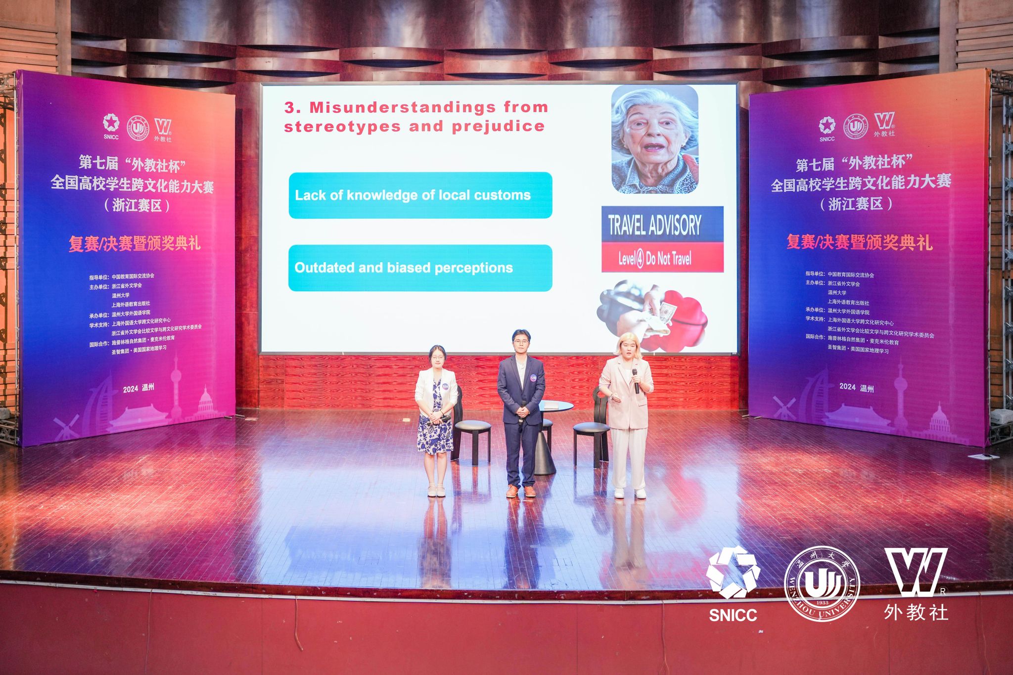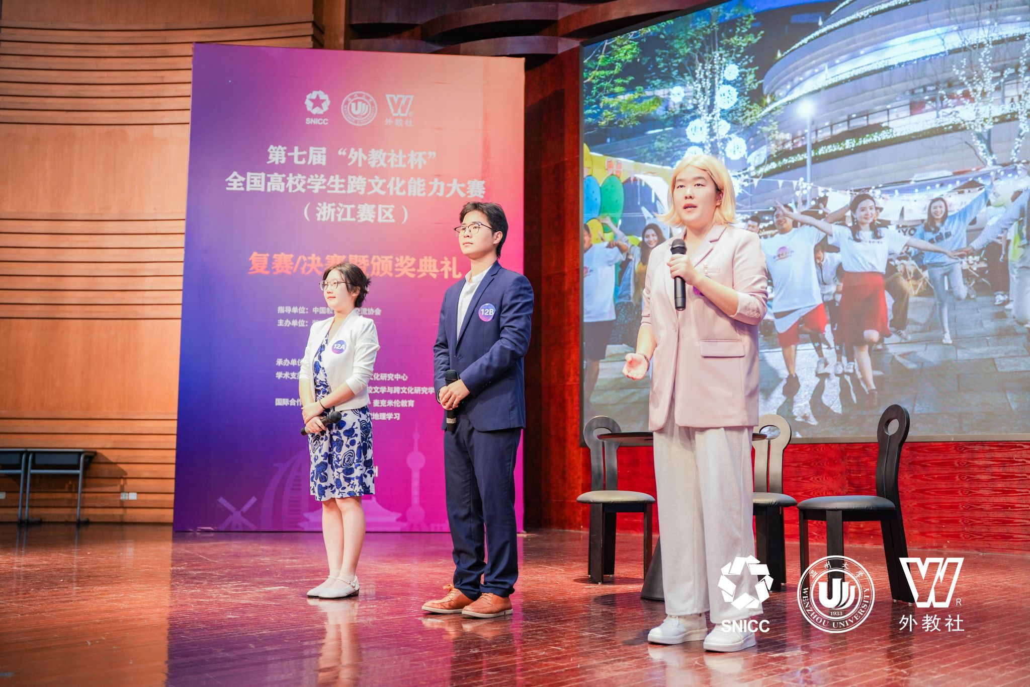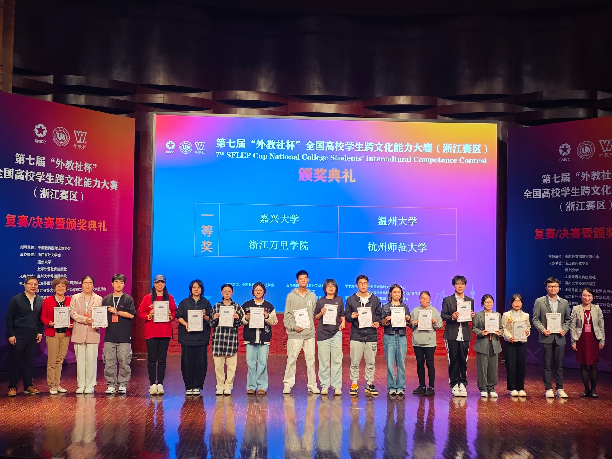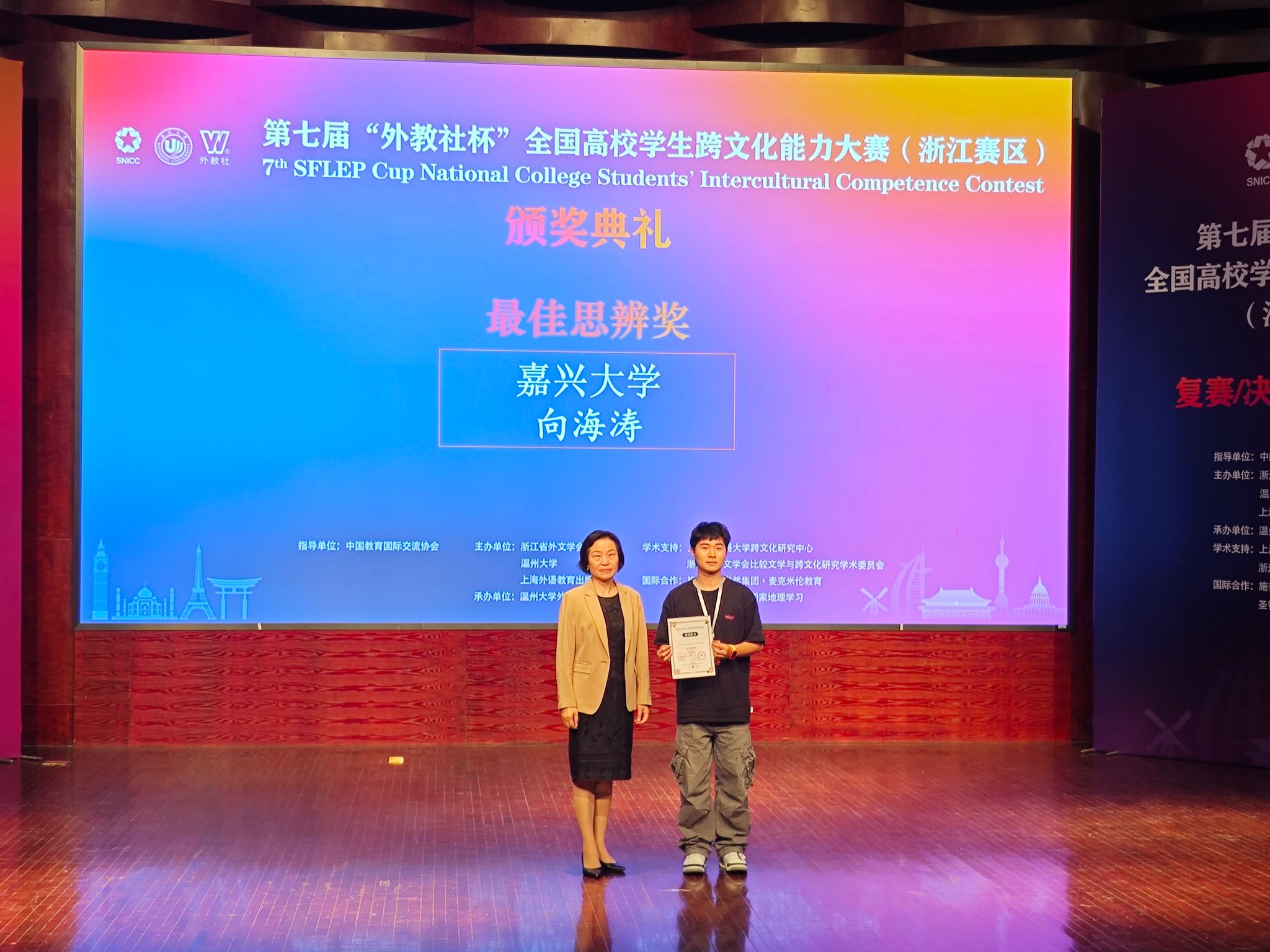 11月16日至17日,第七届“外教社杯”全国高校学生跨文化能力大赛浙江赛区(英文组赛道)在温州大学成功举办,吸引了来自浙江省30所高校的代表队参加。由av在线 陶丹玉、罗国华和鲁俊丰老师指导的学生向海涛、项夕雅和周子璇三位选手代表av在线 参赛获得省级一等奖,其中向海涛同学获得“最佳思辨奖”。这是av在线 学生在该项赛事获奖上取得的新突破。