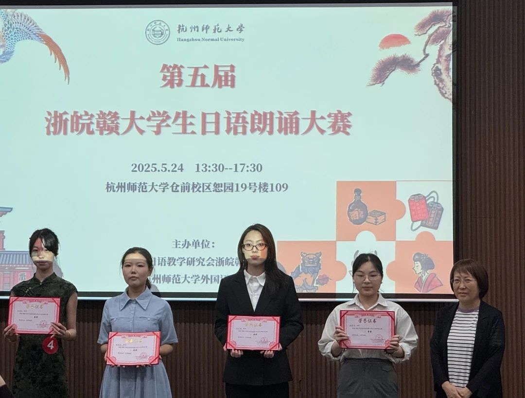 “浙皖赣大学生日语朗诵大赛”是由中国日语教学研究会浙皖赣分会和杭州师范大学av在线 共同举办的一项大赛,至今已举办四届,av在线 日语学子已先后获得二等奖、三等奖和一等奖的好成绩。此次获奖既是对学生专业能力的肯定,也彰显了av在线 外语人才培养的显著成效。我们将继续完善“以赛促学、以赛促教”的培养机制,为培养具有国际视野的高素质日语人才而不懈努力。