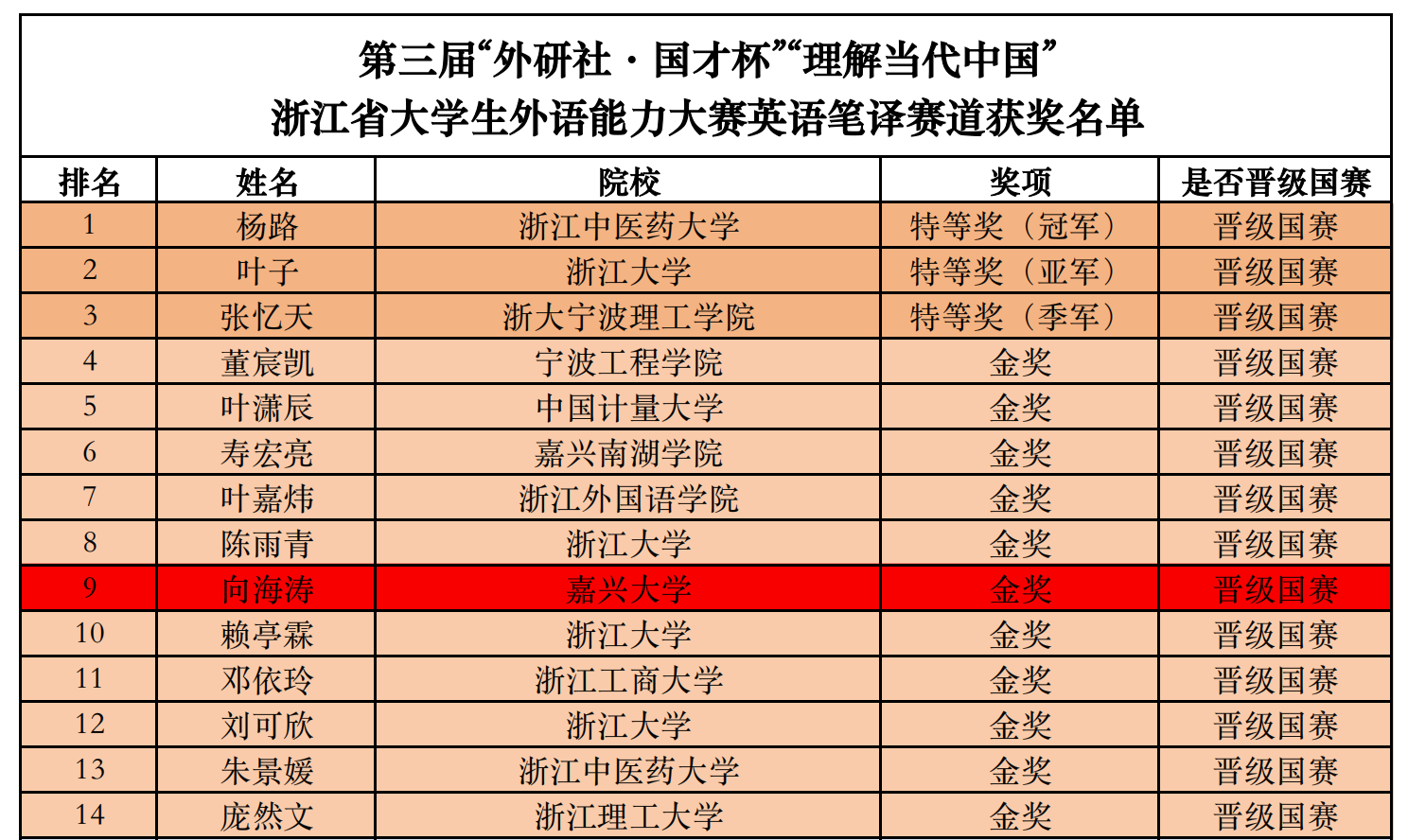 近日,第三届“外研社·国才杯”“理解当代中国”浙江省大学生外语能力大赛英语笔译赛道成绩公布,av在线 英语专业向海涛同学不负众望,以深厚的专业积淀、敏捷的思维与卓越的笔译能力斩获金奖,入围全国总决赛,刷新了av在线 在该赛道的最佳战绩!