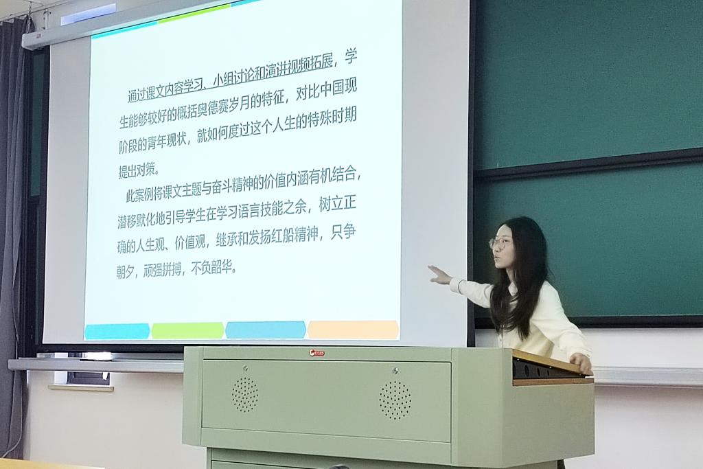 各系部的分享嘉宾用先进的教学理念、精心选取的教学资源、多样化的教学方法以及系统的课堂教学设计赢得了全体点评专家们和与会教师的好评。英语系《基础英语》课程组鲁俊丰、尚广辉、边娜、杨雪梅、潘宁宇及陈文玉老师以课程单元教学内容为对象,从教学设计、思政融入、教学反思等方面进行了精彩的说课,剖析传统文化元素融入教学内容的路径和方法,帮助学生在学习英语语言知识的同时获得对为人处世哲学、中西文化互鉴等方面的认识。日语系张冬老师以《日本文化论》这门课程中涉及到的日本“和魂汉才论、和魂洋才论、风土论、耻文化论、神道、武士道、缩小意识”等文化元素,引导学生从中日文化比较角度正确解读日本文化,提高学生的中国文化自信,提升学生的跨文化交际能力和日语表达能力。大外部高晨笛、陆晓妹老师分别选取《新视野大学英语读写教程》中的单元阅读课文为授课内容,将思政元素潜移默化地融入到课堂教学中,用外语讲中国故事,引导学生感悟中华民族的悠久历史和文化,在注重培养学生的语言应用能力的同时激发学生的批判性思维和开放性思维,提高学生的文化自信,使学生厚植爱国情怀,增强报效祖国的使命感和责任感。
