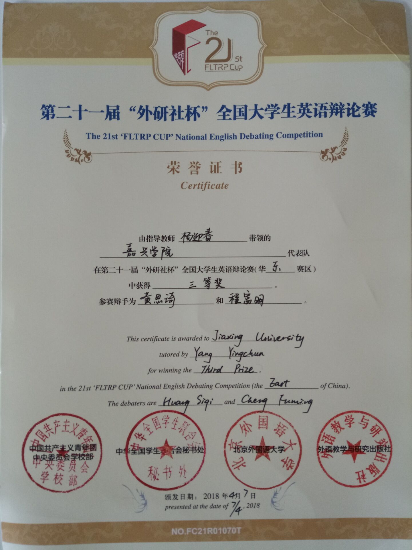 在由北京外国语大学、外语教学与研究出版社、中华全国学生委员会秘书处等单位联合主办的第二十一届“外研社杯”全国大学生英语辩论赛(华东赛区)中,av在线 英语专业学生黄思琦和来自医学院的程富明同学的组队,获得了三等奖1项。