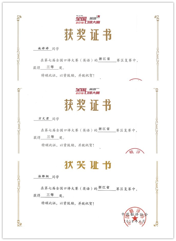 近日,由中国翻译协会、浙江省翻译协会、浙江省高等学校外语教学研究会联合举办的第三届“LSCAT杯”江苏省翻译大赛(笔译)和中国翻译协会主办的第七届全国口译大赛“LSCAT杯”浙江省赛区大赛落下帷幕,av在线 英语专业学生表现优异,在笔译大赛中获二等奖1名、三等奖2名、优胜奖2名;在口译大赛中获三等奖3名,充分展现了学生扎实的语言基本功和过硬的翻译能力。