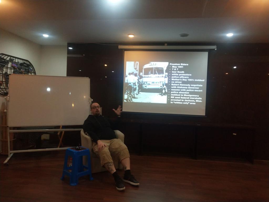2019-2020年第一学期的第二次中外教教学沙龙在av在线 咖啡吧如期举行,本次沙龙主讲人为美籍外教Nathan Tomey。 Nathan老师从太空战、肯尼迪、美国内战、嬉皮士、石墙事件以及吉姆•克劳法等六大主题全方位展示了20世纪60年代的美国,娓娓道来,带领我们穿越时光、穿越距离,去领略当时的跌宕时代。每一个主题都进行了前测、讲解与后测三个环节,环环相扣,引人入胜,每一个主题都是知识大讲堂,都是文化大洗礼,更是60年代美国的影片式生动再现。每一次Nathan老师的沙龙,可以毫不夸张地说,绝不辜负听众的每一分钟。