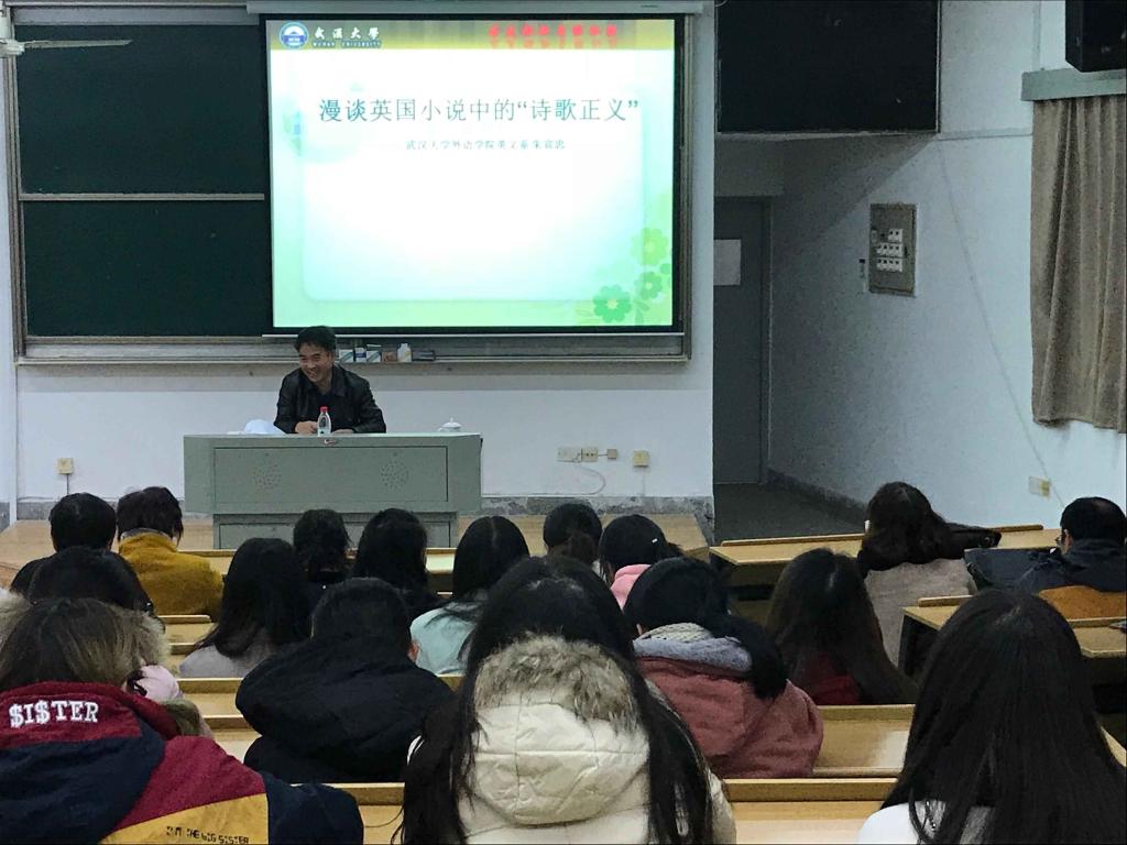 11月30日下午,武汉大学外语学院朱宾忠教授应邀为av在线 师生做了题为“‘诗歌正义’在英国小说中的实现”讲座。