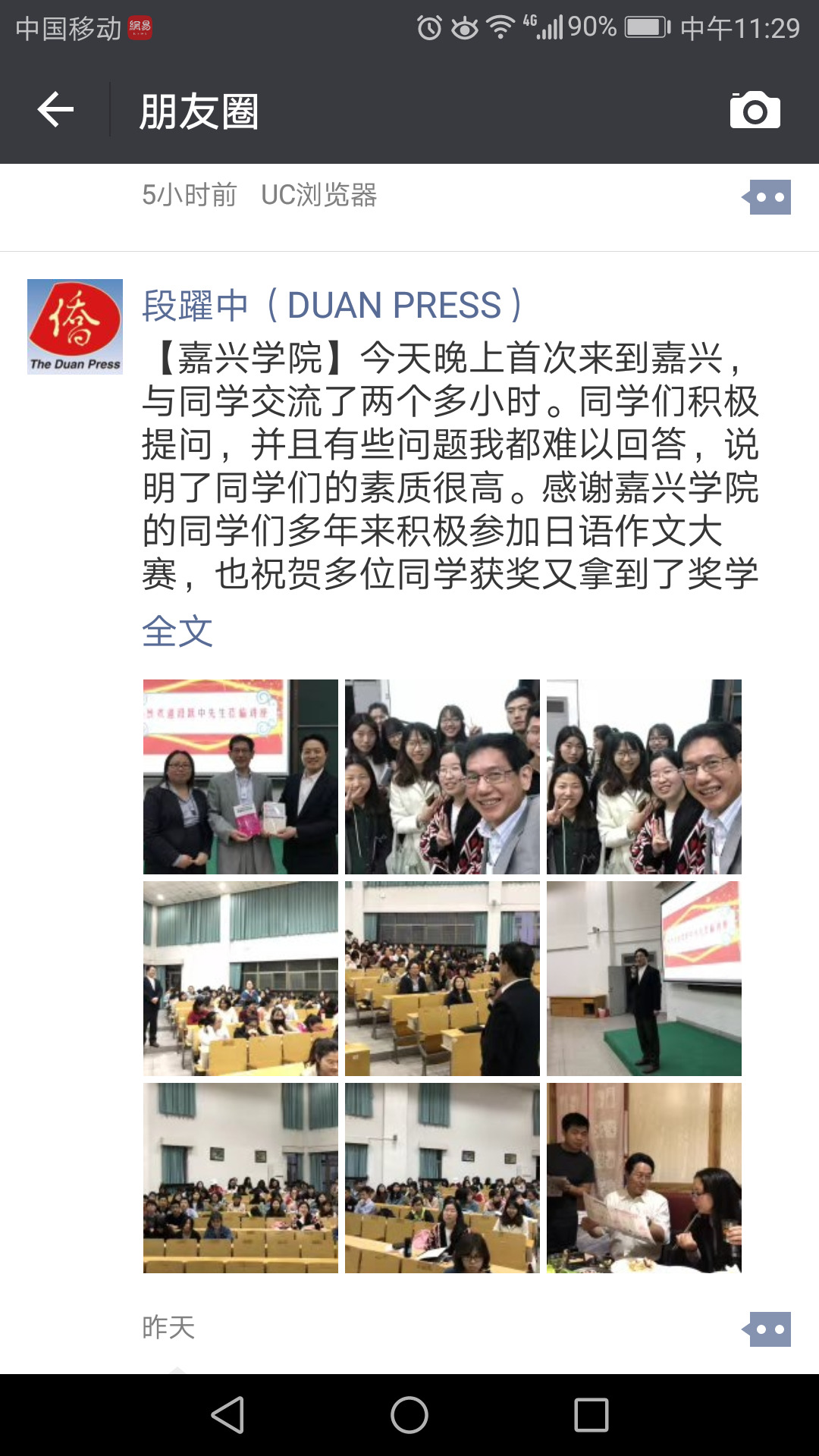 以“面向主流社会,服务中日交流”为宗旨,段先生先后创立了在日中国人文献资料中心、创办了《日本侨报》及日本侨报出版社、日中交流研究所、NPO法人日中交流支援机构等,宣传报道中国,力促中日友好。尤其是段先生力推举办的“中国人日语作文大赛”,迄今已十三届,每年有全国数百所高校共近四千多篇日语作文参赛,是我国迄今为止规模最大、规格最高的一个专业日语教学水平的国家级大赛。在获奖概率仅为2%的激烈竞赛中,近三年,av在线 日语专业5位同学荣获三等奖,10名同学获佳作奖,三次获得“优秀指导教师奖”。特别是其中的金梦莹和朱杭珈两位同学分获480万日元赴日留学奖学金,为浙江省唯一获得此项高额奖学金的高校。av在线 日语专业的教学得到了段先生的首肯,这也是促成段先生此行的一个重要契机。