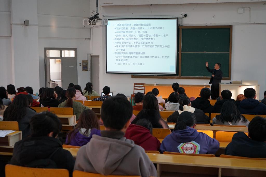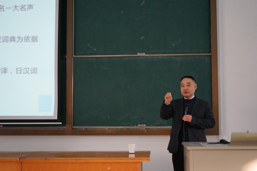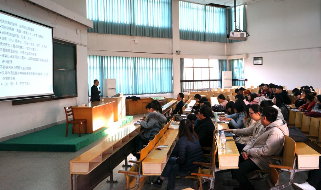 2019年12月12日下午,上海外国语大学施建军教授莅临av在线 ,在外语楼310做了一场题为“关于中日近义词的互译性问题”的学术讲座。讲座由av在线 副院长郭永恩教授主持,日语系全体教师和数名英语系教师以及百余名日语专业学生积极参加了讲座。