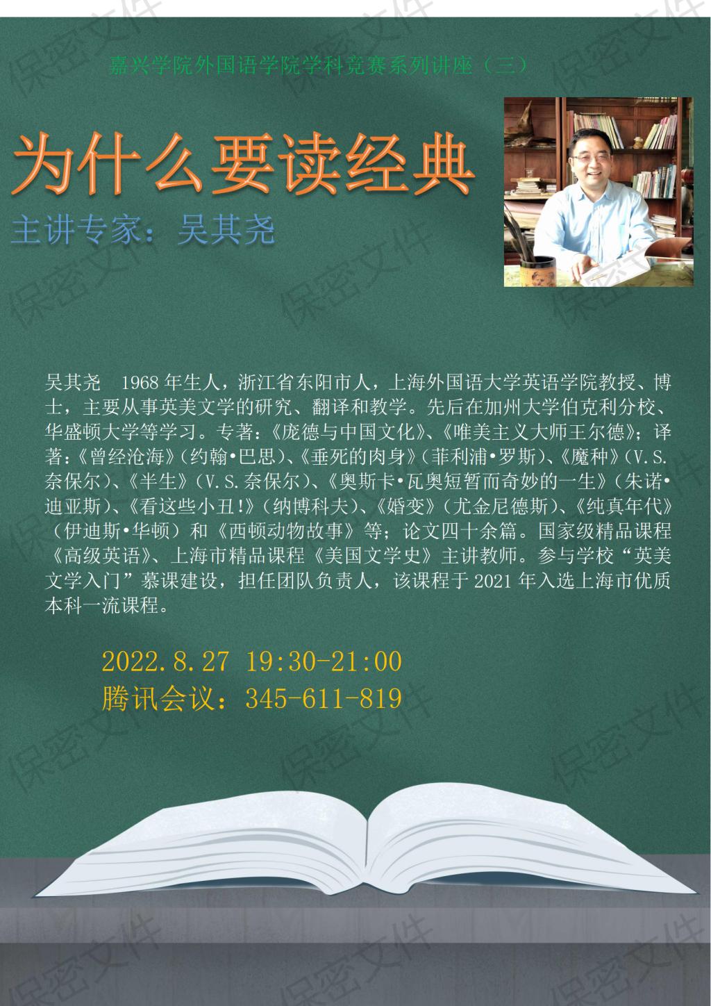 2022年8月27日晚7点30分,上海外国语大学吴其尧教授为av在线 师生举办了一场题为《我们为什么要读经典》的线上讲座。吴教授从大学教育需要有开明的文化修养、开阔的视野、历史的视角和哲学的氛围谈起,论述了“什么是经典”、“为什么要读经典”,以及“如何读经典”三个方面的问题。吴教授认为,经典必须具备如下四个特点:1,应该具有内涵的丰富性,是对人的处境有真切的关心,是对人的命运有深刻的体察,是对人的内心经验有感同身受的体谅和同情;2,应该具有实质的创造性;3,应该具有时空的跨越性;4,应该具有无限可读性。讲座中吴教授古今中外的文学经典信手拈来,用大量生动、富有启发意义的经典文本带领师生们走进一场学术盛宴。讲座中吴教授和师生们即时互动,并解答了师生们的问题。