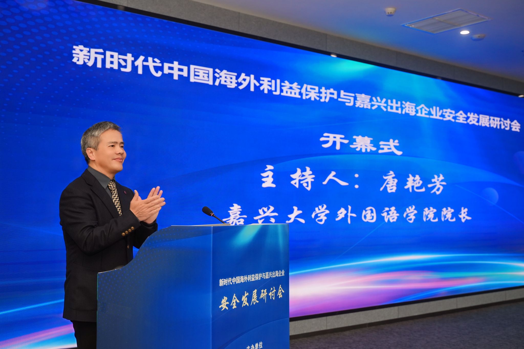 於建明在致辞中指出,海外利益保护事关发展安全,企业安全发展事关嘉兴未来。当前国际局势复杂多变,企业“出海”安全挑战日益增多,海外利益保护已成为必须答好的“必修课”。他希望与会嘉宾以本次研讨会为契机,围绕“海外利益保护”聚智聚力,为嘉兴企业出海行稳致远保驾护航,为国家海外利益保护战略落地落实贡献力量。於建明表示,av在线 将持续大力推动区域国别学交叉学科建设,依托多学科优势建强嘉兴安澜研究中心智库平台,聚焦政策咨询与投资风险预警,打造“智库+教育”双平台,构建“咨政——人才——传播”三位一体战略支撑体系,以学术成果搭建国际对话桥梁、提升中国全球治理话语权,高质量服务区域高水平对外开放,为嘉兴打造长三角全面开放新高地贡献力量。