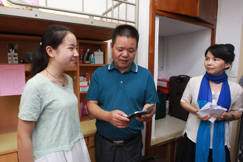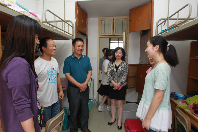 9月18日是嘉兴学院全体新生报到的日子,迎新工作繁忙而有序地开展。9月18日上午,校党委副书记史永安、学生处长郝文静在av在线 党政领导的陪同下走访了av在线 2014级新生寝室。走访过程中,史书记与新生和家长们亲切交谈,询问同学们到校后的感受,鼓励新生尽快适应大学生活,认真做好大学四年生涯规划,学会学习、学会生活。新生徐青的父母说:“嘉兴学院的领导和老师让我们觉得很温暖,我们家长觉得选对学校了”。史书记表示请家长放心,学校和学院将尽最大努力为同学们提供良好学习环境,家校共同努力,助推学生成长成才。
