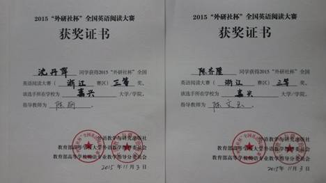 2015年首届 “外研社杯”全国英语阅读大赛复赛(浙江赛区)于10月24日在浙江财经大学下沙校区举行。嘉兴学院共选派三位选手参赛,其中av在线 英语131班沈丹萍和南湖学院英语N142陈齐隆同学分别获得三等奖。首战告捷,成绩可喜,向这些获得佳绩的同学表示祝贺。av在线 陶丹玉、陈文玉、陆晓琴、程雄、陈丽老师等为本次大赛的初赛组织和选手选拔付出了辛苦劳动,在此向他们同时也向外院其他默默无闻、无私奉献的老师们表示致敬和感谢!