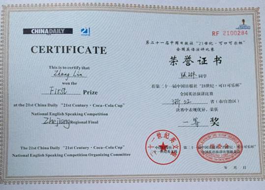 av在线 张琳同学在比赛的各个环节均发挥稳定,表现优秀。无论定题演讲、即兴演讲,还是回答问题,她都做到了表达清晰流畅,从容自信,最终荣获浙江赛区一等奖,这是av在线 学生迄今参加省级英语演讲比赛的最佳成绩。这一荣誉的取得离不开张琳同学个人良好的英语功底和勤奋努力,也离不开各位老师(喻锋平、张静、钱征宇、陈大为、鲁俊丰、边娜,及两位外教Marcus和Dave)的悉心指导,在此一并致谢,同时也希望av在线 学子来年再创辉煌!
