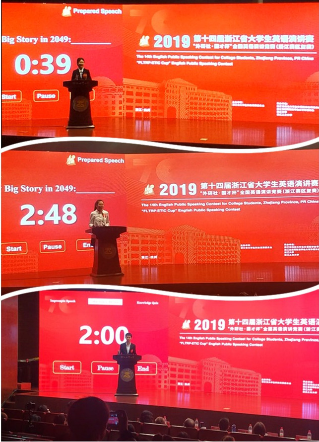 2019年10月26,27日“外研社·国才杯”全国英语演讲竞赛(浙江赛区复赛)在浙江杭州浙江工业大学屏峰校区举行。来自浙江省54所高校的160名选手参加了此次比赛。经过两天激烈的角逐,av在线 选送的选手何鑫,杨惠敏和章馨尹取得了省赛二等奖一项,三等奖两项的好成绩。