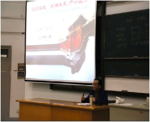 为进一步指导新生全面系统地了解宗教知识,树立正确的宗教观念,av在线 于2020年11月25日晚在外语楼310开展了新生宗教政策宣讲讲座。本次讲座邀请了文法学院副院长步珏良副教授主讲,av在线 20级全体新生参加了讲座。