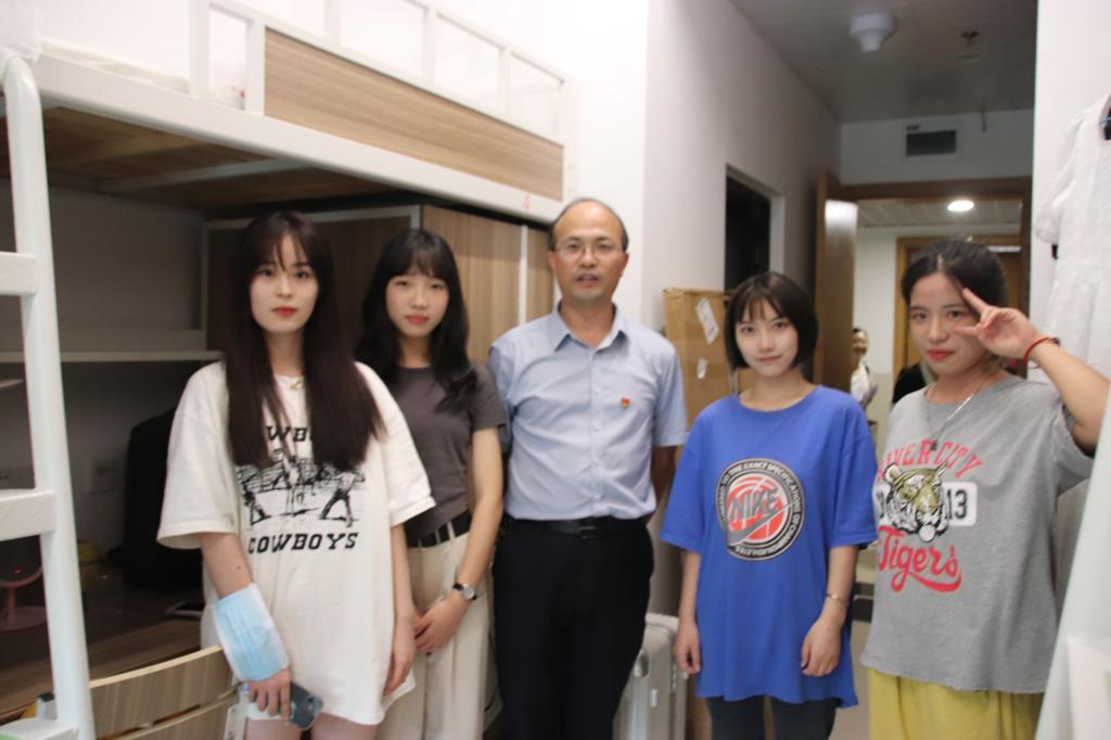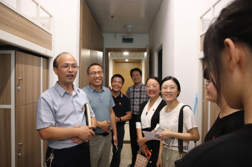 9月9日下午,校党委委员、副校长杨培强在av在线 党政领导班子和学工办老师的陪同下走访了新生宿舍,为2021级新生送去温暖的问候与祝福。