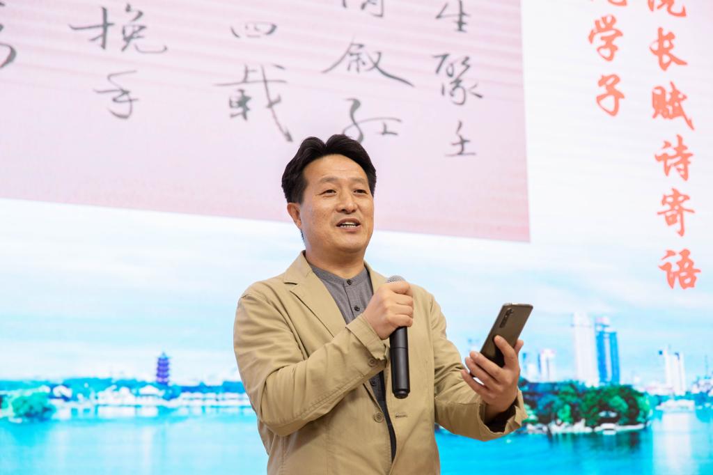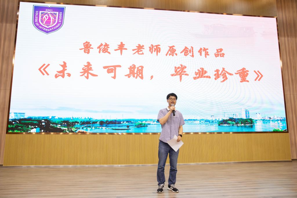 教师代表鲁俊丰老师为毕业生带来原创作品《未来可期,毕业珍重》。鲁俊丰老师回忆着与2018级同学们的许多往事,可是时间就是这样,如滔滔大河向前奔流,谁也无法留住逝去的青春。在最后,鲁老师教诲同学们“认真做一件事情,只能把事情做对;用心做一件事情,才能把事情做好。”
