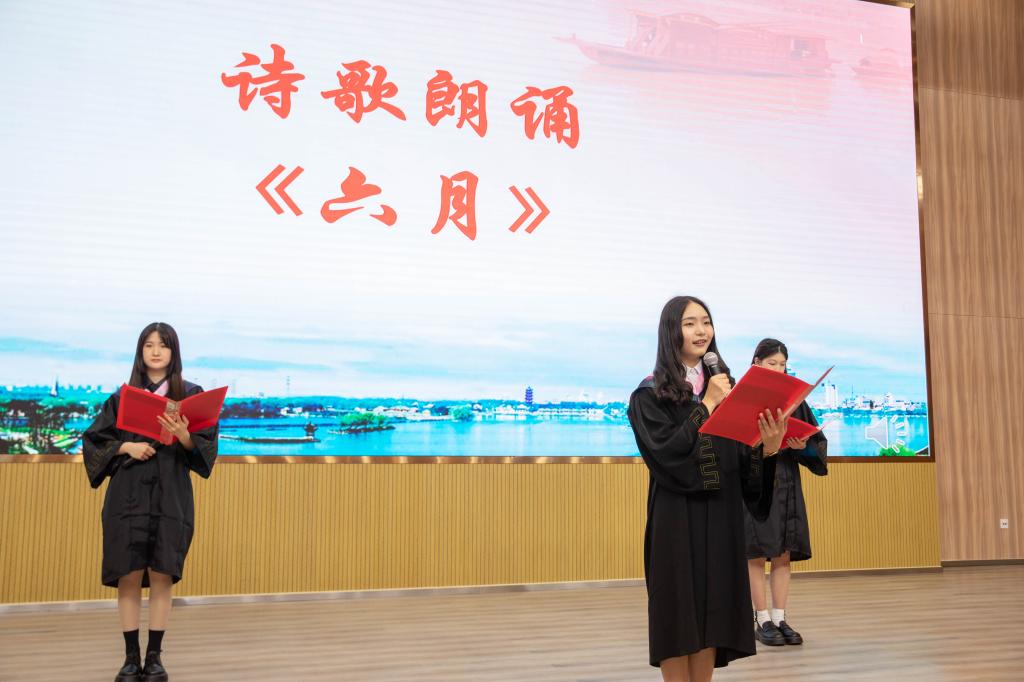 首先,三位毕业生代表褚添璐、龚书晗和夏亦怡进行诗歌朗诵。他们怀着对大学的深深眷恋和对未来生活的无限憧憬,在一句句话语中回忆着过去四年大学生活:大一是热情的橙色,大二是旺盛的绿色,大三是沉着的蓝色,大四是朦胧的灰色。四年的大学生活给每一位外院学子都留下了美好而深刻的回忆。