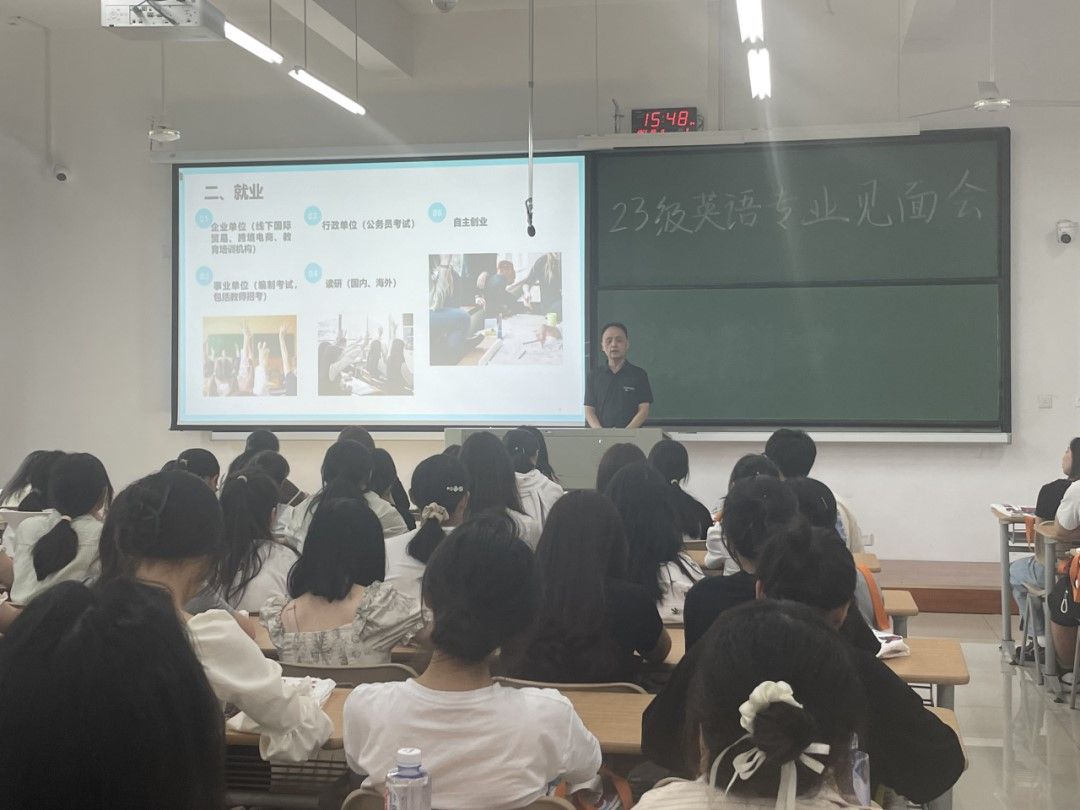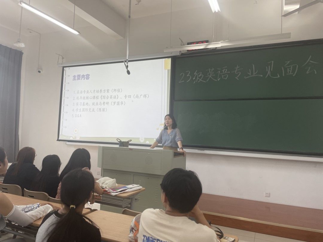 又是一年开学季,正是橙黄橘绿时。美丽的嘉院迎来了90位来自祖国四面八方的英语专业新生。他们怀揣梦想,带着憧憬,走进av在线 ,开启了新的人生之旅。为帮助新生更快适应大学生活,2023年9月10日下午,英语系在兴德楼123举办2023级英语专业新生见面会。会议由英语系主任邱佳博士主持,英语系尚广辉老师、陈丽老师、罗国华老师等出席。他们从人才培养方案、基础英语学习、专业等级考试、实习就业、考研留学等方面与新生做了面对面交流。