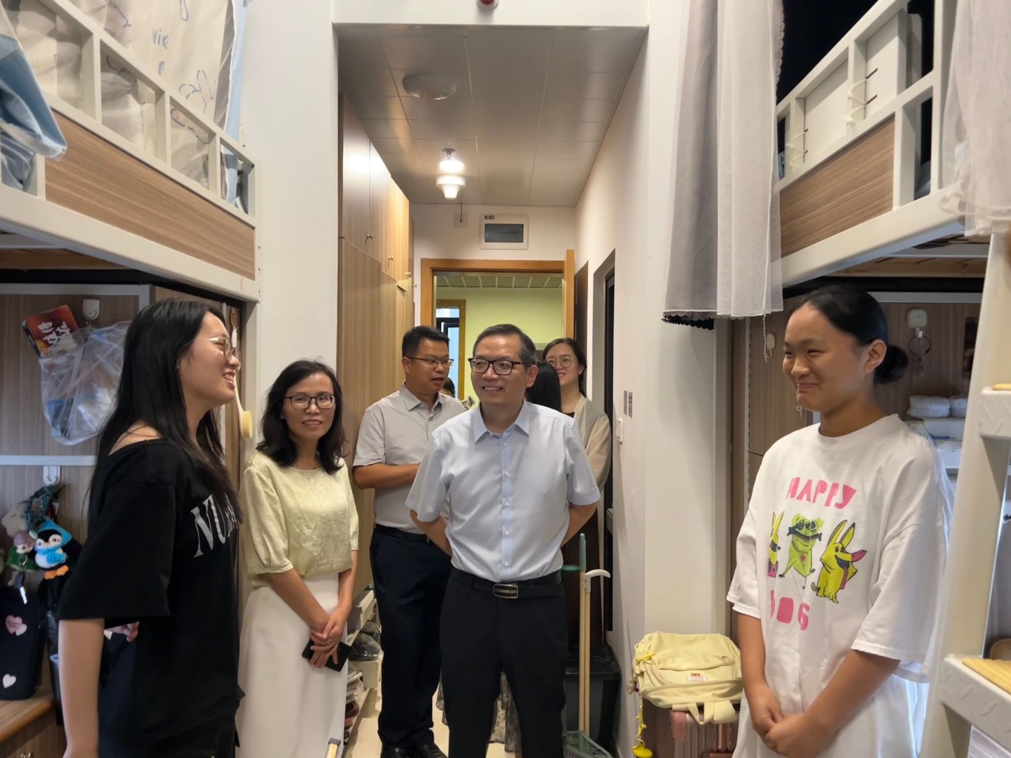 9月18日下午,副校长周宏伟走访av在线 学生寝室,看望首届翻译硕士研究生新生、结对寝室同学,实地了解学生生活与学习情况,传递学校关怀。学院党政领导班子随同走访。