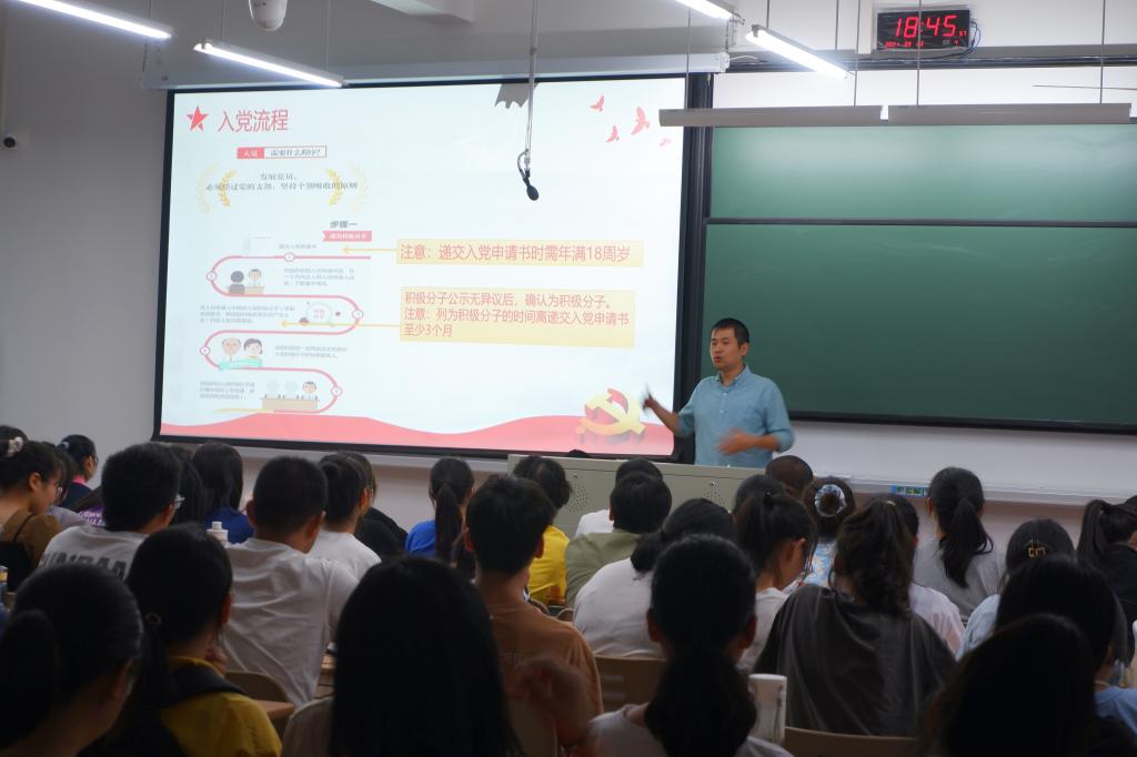 9月23日晚,av在线 党员之家负责人胡涛老师在兴德南楼223为21级新生开展了“入党启蒙教育大会”。胡涛老师首先向 2021级新生阐述了中国共产党的性质、宗旨、基本原则等基本理论知识,并就入党的相关程序、要求及发展党员工作细则作了详细的说明,同时向新生们介绍了av在线 学生支部概况。他要求同学们要端正入党动机、树立为国家和人民服务的宗旨,鼓励新生积极向党组织靠拢,提高自身的理论和实践能力,不断提高综合素质。
