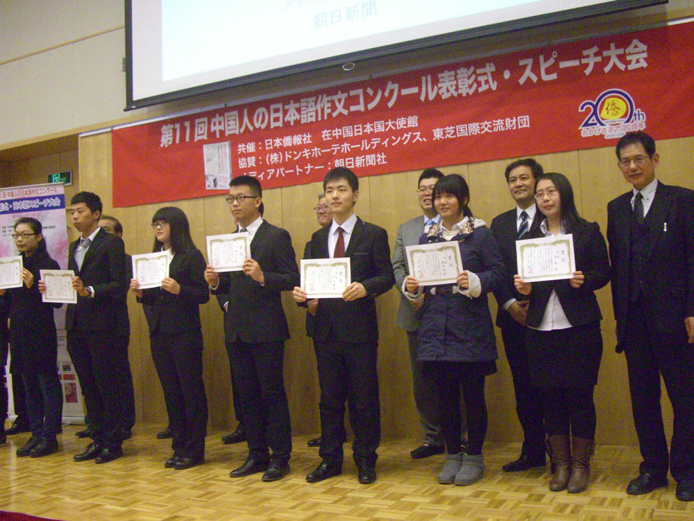 由日本侨报社日中交流研究所主办,日本驻华大使馆、人民日报社、人民网、中国中日友好协会等机构和团体协办的“第11届中国人日语作文大赛”颁奖仪式于12月12日在北京日本驻中国大使馆举行。av在线 日语专业131班的牛宝伦同学荣获三等奖;方啸(日语122班)、戴蓓蓓(日语121班)、朱杭珈(日语122班)、霍思静(日语131班)、陈子轩(日语131班)五名同学获佳作奖。