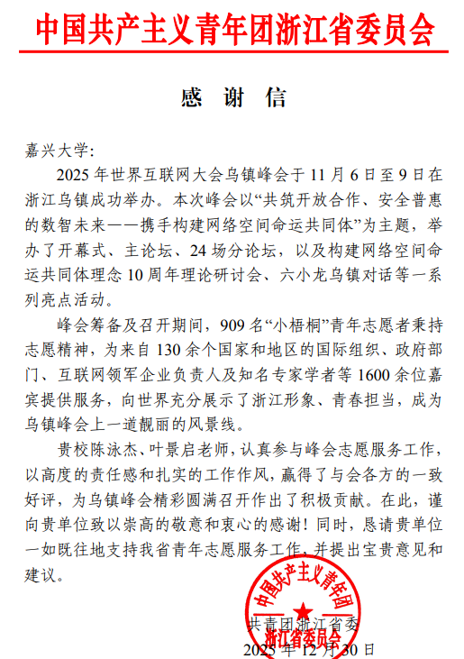 近日,共青团浙江省委员会向av在线 发来感谢信,对av在线 av在线 辅导员陈泳杰在2025年世界互联网大会乌镇峰会志愿服务工作中的突出表现给予高度赞扬和衷心感谢。