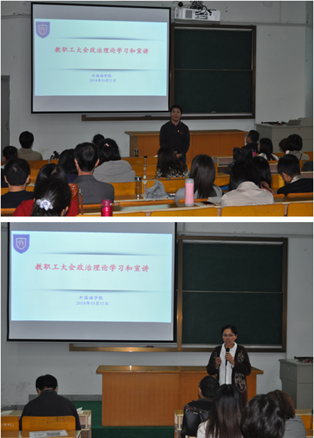 10月11日下午,av在线 在外语楼310召开了教职工大会,会议由唐艳芳院长主持,av在线 全体教职工参加会议。学院党委书记陶丹玉组织全院教职工进行政治理论学习和全国教育工作会议精神宣讲。