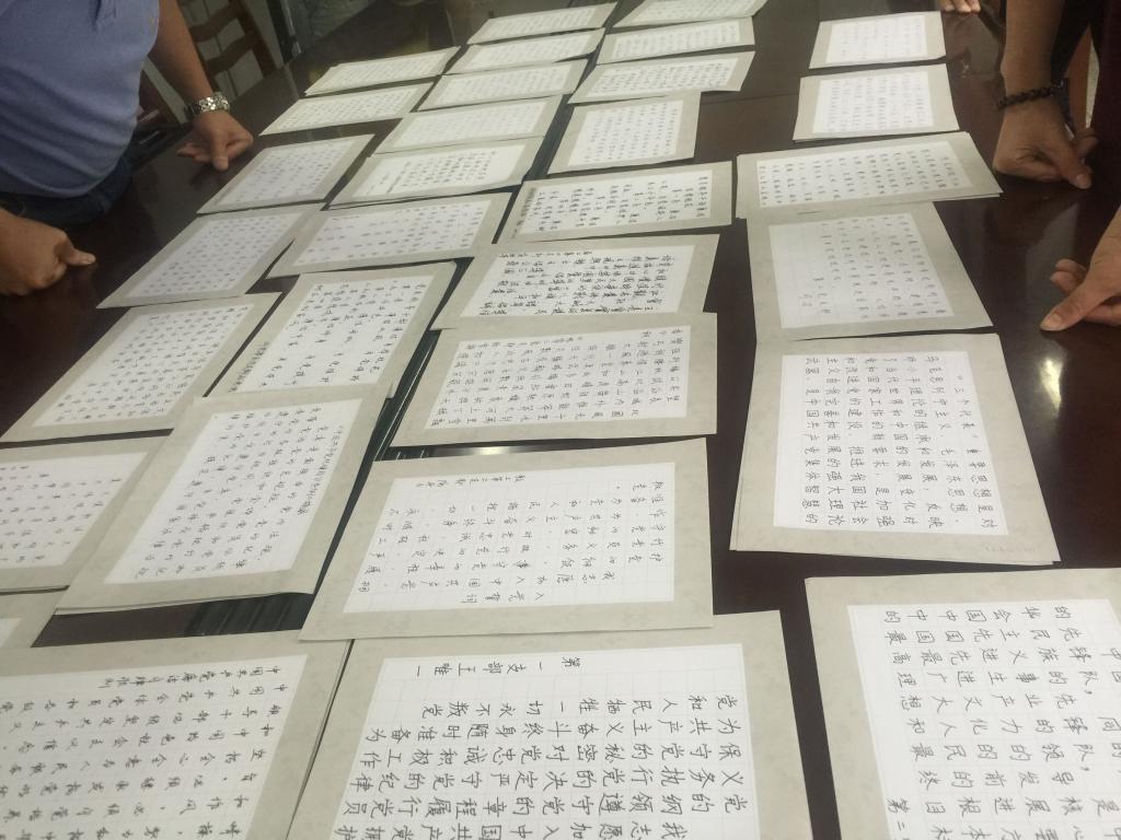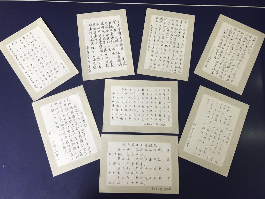 英语教工支部为了组织好此次活动,从前期酝酿,到过程实施和后期评奖,都做了精心设计和安排。在书法写作内容上,鲁俊丰和杨雪梅两位支部书记专门为五个支部分别设计了入党誓词、党章、社会主义核心价值观、廉政纪律准则以及爱国诗词等五个主题内容。党员们通过一次次练习书写,重温入党初心,牢记纪律准则,强化党员意识,抒发爱国热情,铭记作为一名共产党员的职责与荣誉。本次大赛党员教师参与热情高,参与率超过90%,活动激发了全体党员为人民服务的热情,有效增强了av在线 党组织的凝聚力。