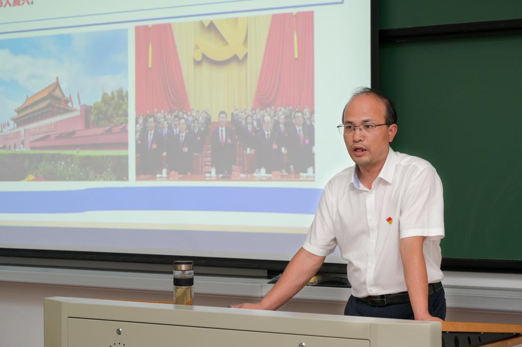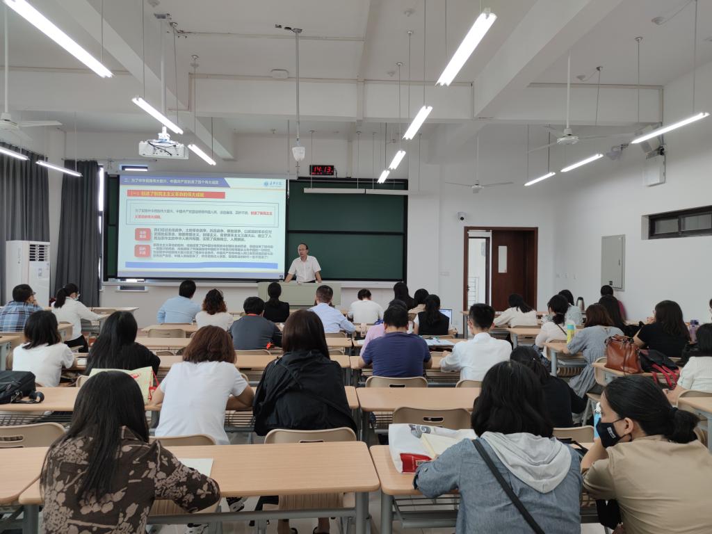 10月14日,校党委委员、副校长杨培强在兴德楼南楼205为av在线 师生作习近平总书记在庆祝中国共产党成立100周年大会上的重要讲话精神的辅导报告,学院党政班子成员、全体教职工以及党员学生代表参加此次理论宣讲学习活动。