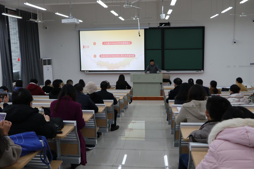 为深入学习贯彻党的十九届六中全会精神,全面准确把握全会精神的核心要义和主旨精髓,12月16日下午,av在线 邀请校人文社科处处长彭冰冰教授作党的十九届六中全会理论宣讲报告会,主题为“历史经验与马克思主义中国化——学习领会党的十九届六中全会精神” 报告会由学院党委书记周钰主持,学院党政领导班子成员、全体教职工参加。