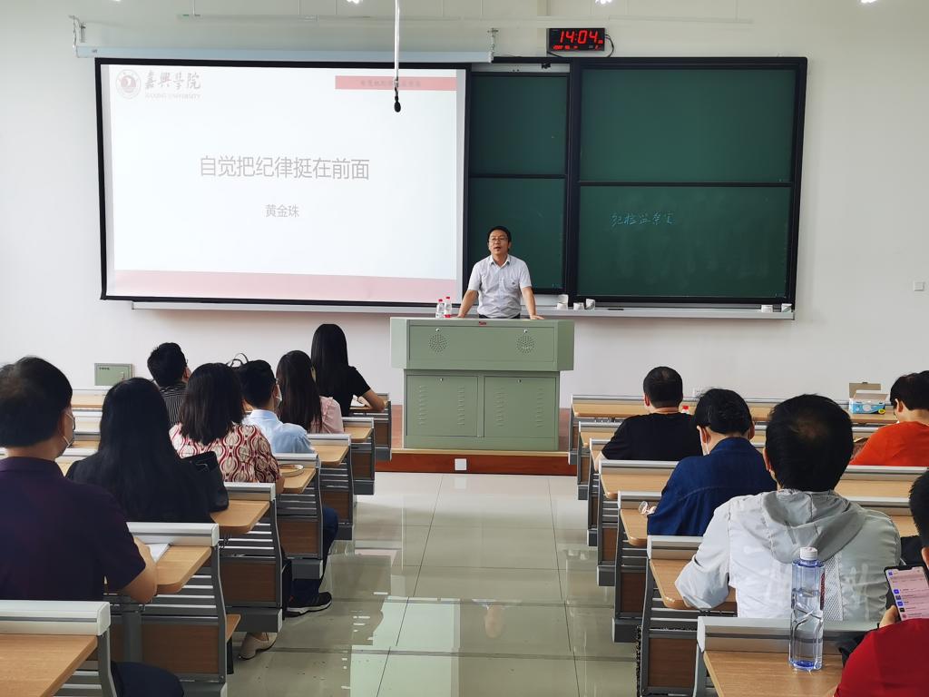 黄金珠以“自觉把纪律挺在前面”为题,从为什么要自觉把纪律挺在前面、高校各类违纪行为的表现和成因、纪律素养是自律与他律的统一以及领导干部从严要求四个方面深入分析了高校做好廉政建设工作的重要性。