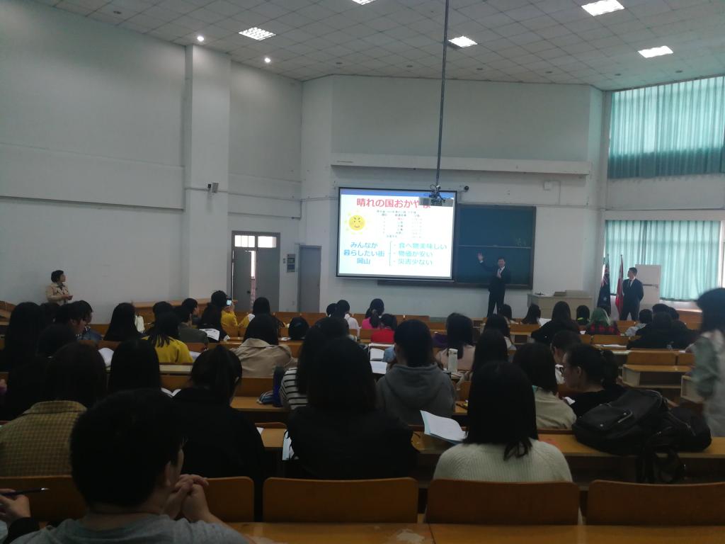 下午,大东正虎和韩壮两位先生在外语楼310教室面向日语专业大二和大三学生进行了宣讲,宣讲会由日语系主任刘韵超老师主持。他们详细介绍了两校实施的“2+2”和“3+1”留学项目之后,也介绍了冈山的地缘优势,蓝天之国、城市安宁,物价低廉,人情厚重,是留学生求学和生活的理想选择。还特别介绍了冈山商科大学考研率位及全日本高校第一位的优势,并欢迎毕业后有意在日攻读硕士学位的学生前来冈山商科大学留学。宣讲会上,同学们就留学费用、学习科目、授课形式和生活设施等积极提问,两位先生逐一认真回答。国际交流处的李月顺副处长和延梅花老师随后也介绍了我们学校鼓励学生赴外留学的温情举措。在播放了去年8名av在线 在冈山商科大学留学同学自己制作的视频之后,宣讲会圆满结束。