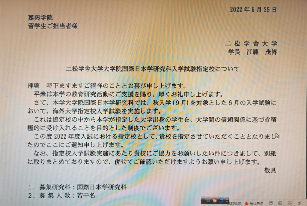 在学校国际交流处的大力支持下,av在线 日语专业与日本二松学舍大学建立了稳定的国际交流关系。鉴于多年来与日本二松学舍大学3+1项目顺利实施,今年,日本二松学舍大学将av在线 确定为二松学舍大学国际日本学专业硕士研究生推荐校,希望录用av在线 优秀日语专业毕业生赴日读研。今年2月和6月,av在线 日语专业组织了4名毕业生参加日本二松学舍大学硕士研究生考试,考试时间、内容和录用通知与日本国内同步进行。6月17日,av在线 日语专业4名毕业生均以优异的成绩通过了日本二松学舍大学硕士考试,被日本二松学舍大学录取为国际日本学专业的硕士研究生,录取率为100%。