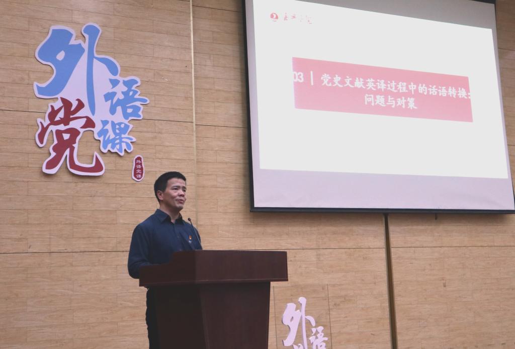 党课在全场齐唱雄壮的《国际歌》之后开讲。唐艳芳从话语和话语体系的概念切入,围绕《中国共产党革命精神:从南湖到西柏坡》的英译实践,带领同学们深入探讨了党史文献和红色文化英译过程中话语转换的意义、问题和方法。他指出,做好党史文献英译的话语转换,一要提高认识、转变观念;二要立足中国、增强自信;三要积极探索、提高效率。最后,他勉励同学们作为新时代大学生要坚定“四个自信”,增强“四个意识”,做到“两个维护”,用外语讲好中国红色故事。