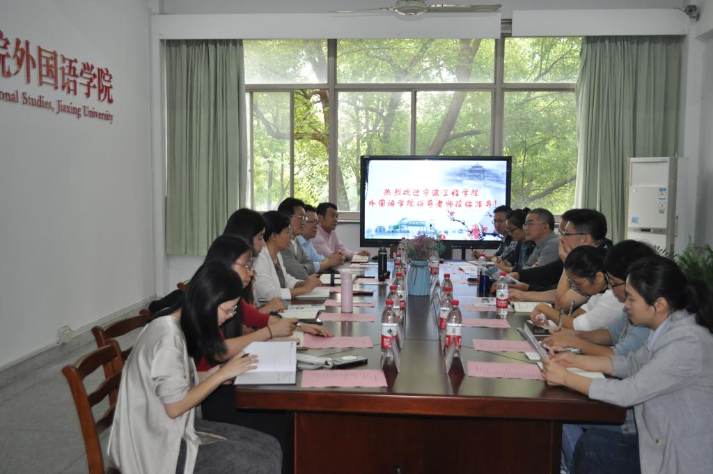 av在线 书记陶丹玉对宁波工程学院av在线 党政领导班子一行的到来表示欢迎,并介绍了学院基本情况以及学院在师资培养、人才引进、考核奖励、培训创收等方面的工作情况,分享了学院在学校政策支持下通过人文关怀、细节服务等工作广纳人才的具体举措。郭永恩副院长、喻锋平副院长和周钰副书记分别就分管科研、教学和学工等工作向来访客人作了详细介绍,侧重介绍了学院在外聘海外商科专业教师授课、校企合作等方面的新尝试,依托红船研究中心进行红色文化翻译等科研工作方面的新突破,公共外语教学分级分类改革新方案,以及学生竞赛项目培育“三结合”(结合学校特色、专业特色、时政热点大背景)方面的新成果。