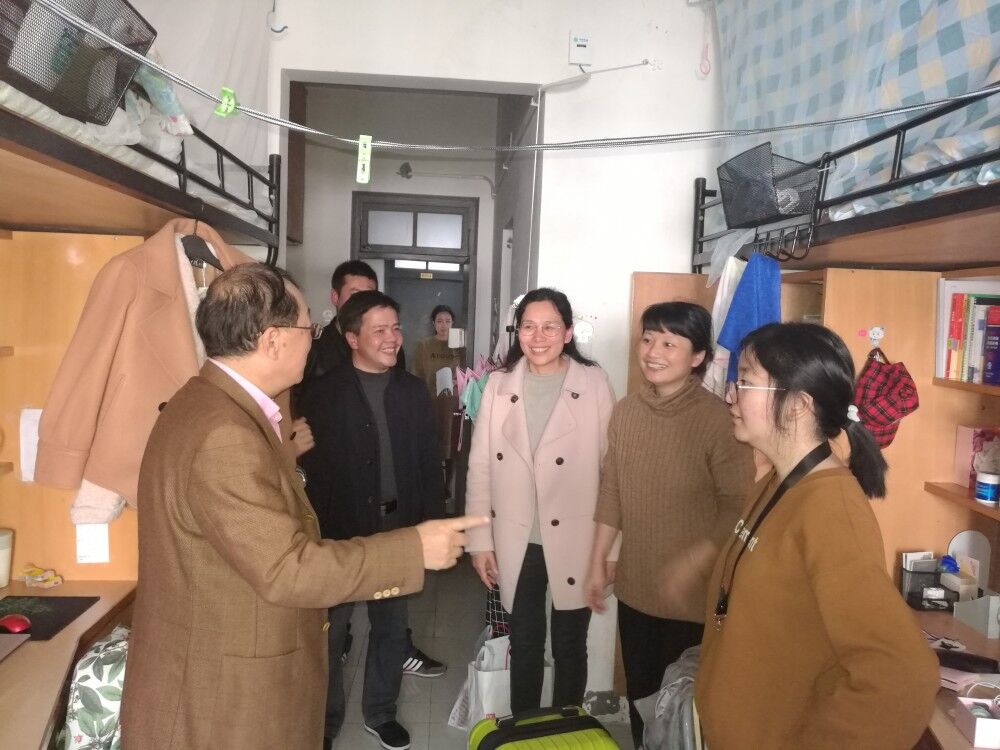 2018年3月4日下午,嘉兴学院副校长费建文在av在线 党政领导班子的陪同下走访学生寝室。