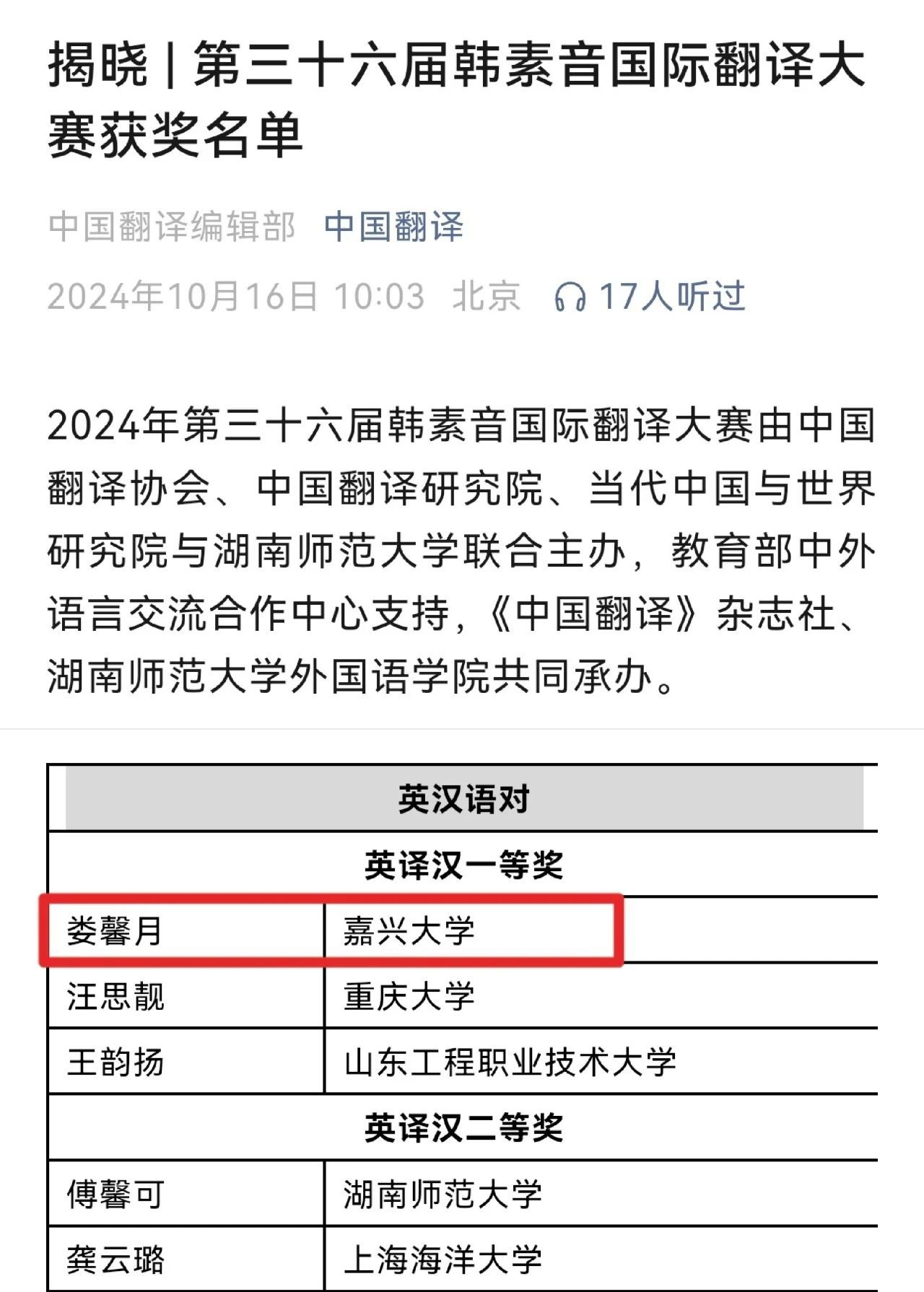 10月16日,第三十六届韩素音国际翻译大赛获奖名单揭晓,外院学生娄馨月在众多优秀参赛者中脱颖而出,高居榜首,荣获英译汉一等奖。喜讯传来,全院师生倍感振奋!