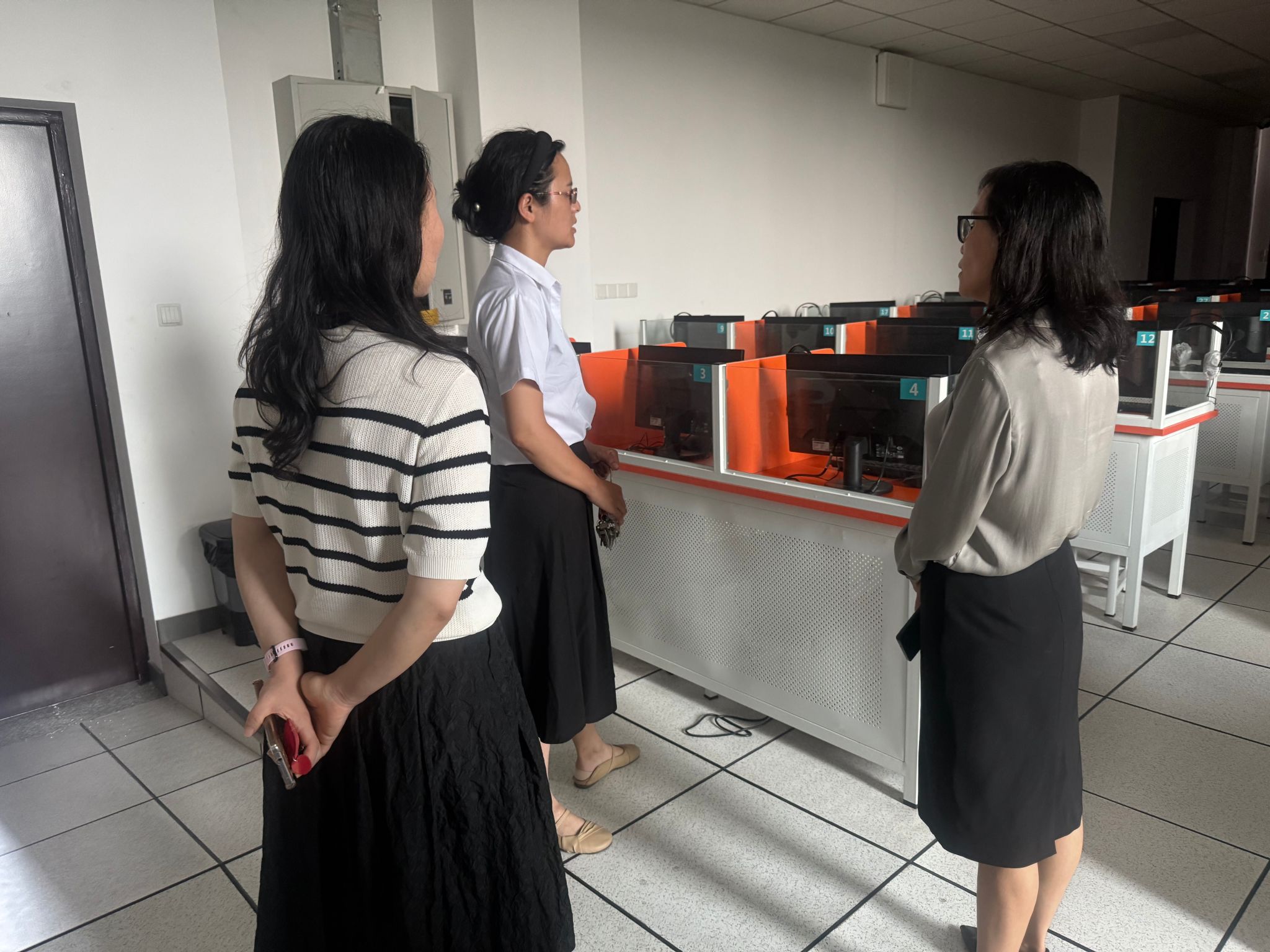 检查过程中,学院领导班子成员走访检查了各行政办公室、系部教研室,语音室等功能性用房,仔细查看消防设施是否完好有效、电气设备是否存在安全隐患、值班人员是否落实等。刘巧芝要求语音室提前对机房的电脑等设备进行检查,如发现问题及时上报学校进行检修,为新学期各项工作的顺利开展提供保障。