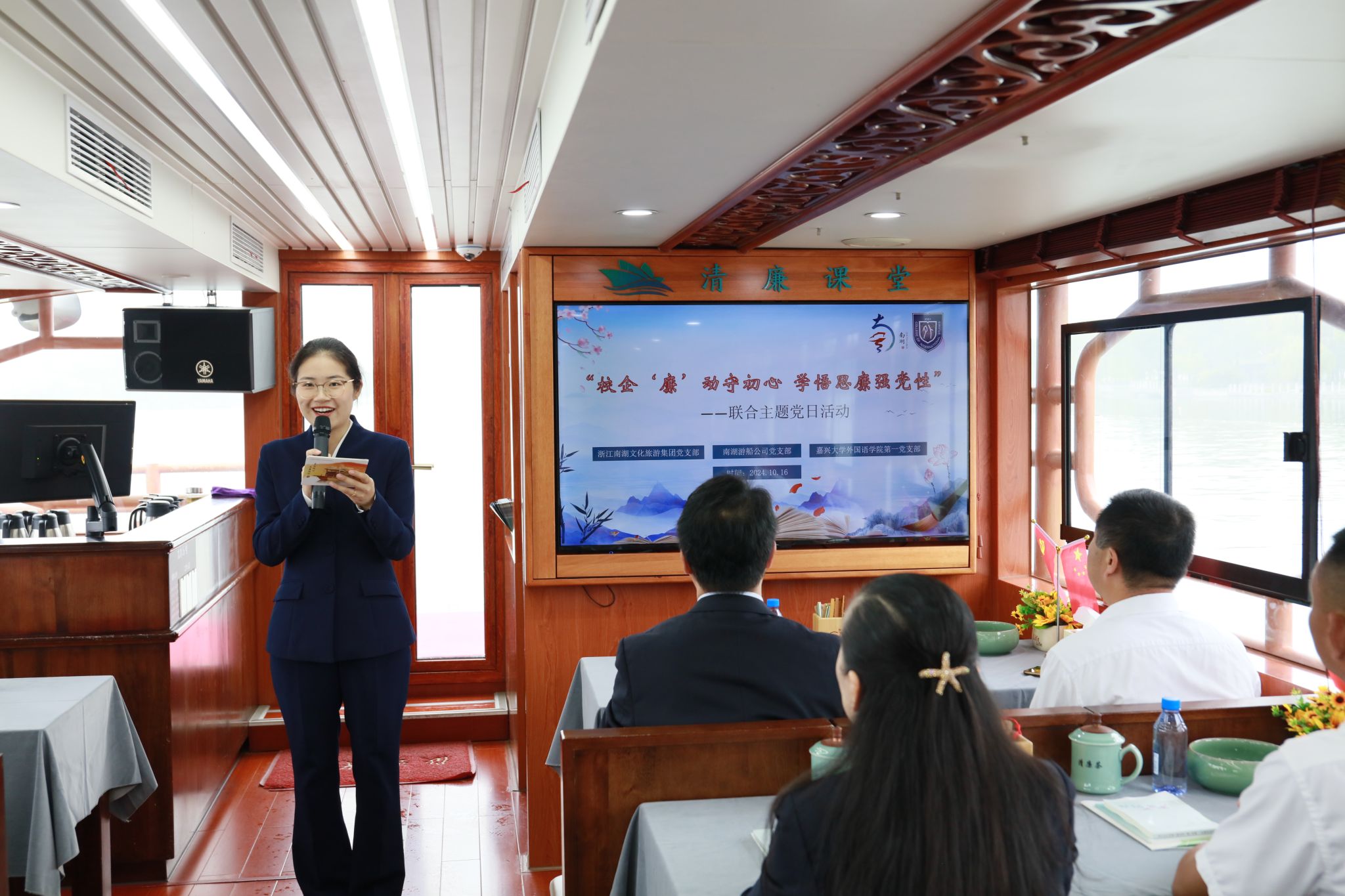10月16日上午,av在线 第一党支部联合南湖文旅党支部、游船公司党支部组织开展了以“校企‘廉’动守初心 学悟思廉强党性”为主题的南湖清风行的“水上廉课”联学活动。